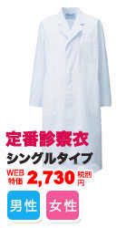 30年来のロングセラーをすっきりとしたシルエットに変え、リニューアルしたシングルタイプの長袖診察衣。