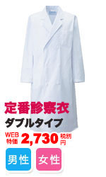 30年来のロングセラーをすっきりとしたシルエットに変え、リニューアルしたダブルタイプの長袖診察衣。